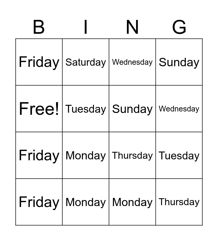 This bingo card has 16 words: Monday, Tuesday, Wednesday, Friday, Friday, Saturday, Thursday, Monday, Free!, Tuesday, Friday, Sunday, Monday, Wednesday, Sunday and Thursday.