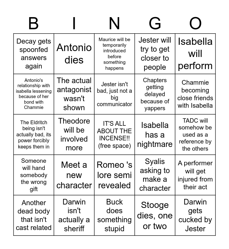 This bingo card has a free space and 24 words: Another dead body that isn't cast related, Meet a new character, Jester isn't bad, just not a big communicator, Stooge dies, one or two, Isabella will perform, Decay gets spoonfed answers again, Antonio dies, Maurice will be temporarily introduced before something happens, Isabella has a nightmare, TADC will somehow be used as a reference by the others, The Eldritch being isn't actually bad, its power forcibly keeps them in, The actual antagonist wasn't shown, Syalis asking to make a character, A performer will get injured from their act, Antonio's relationship with isabella lessening because of her bond with Chammie, Darwin isn't actually a sheriff, Buck does something stupid, Jester will try to get closer to people, Chammie becoming close friends with Isabella, Someone will hand somebody the wrong gift, Theodore will be involved more, Romeo 's lore semi revealed, Chapters getting delayed because of yappers and Darwin gets cucked by Jester.