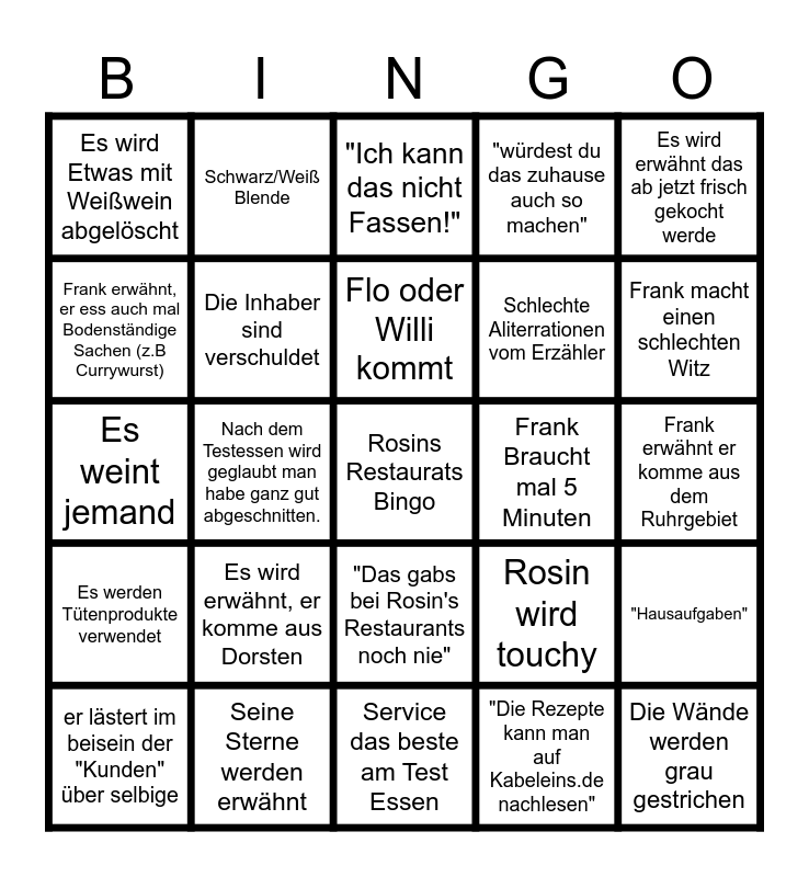 This bingo card has a free space and 24 words: Es wird erwähnt, er komme aus Dorsten, Seine Sterne werden erwähnt, Flo oder Willi kommt, er lästert im beisein der "Kunden" über selbige, Es wird erwähnt das ab jetzt frisch gekocht werde, Es wird Etwas mit Weißwein abgelöscht, Frank erwähnt, er ess auch mal Bodenständige Sachen (z.B Currywurst), Schwarz/Weiß Blende, Frank Braucht mal 5 Minuten, "Das gabs bei Rosin's Restaurants noch nie", Schlechte Aliterrationen vom Erzähler, Es weint jemand, Rosin wird touchy, "Hausaufgaben", Die Inhaber sind verschuldet, "Die Rezepte kann man auf Kabeleins.de nachlesen", Frank erwähnt er komme aus dem Ruhrgebiet, "Ich kann das nicht Fassen!", Frank macht einen schlechten Witz, Nach dem Testessen wird geglaubt man habe ganz gut abgeschnitten., Die Wände werden grau gestrichen, Es werden Tütenprodukte verwendet, "würdest du das zuhause auch so machen" and Service das beste am Test Essen.