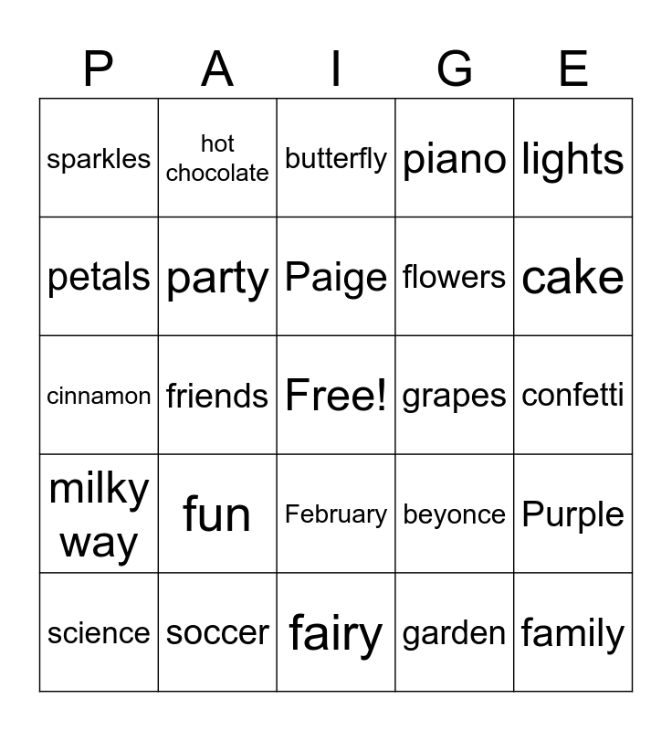 This bingo card has a free space and 28 words: Purple, pastels, flowers, garden, petals, butterfly, hot chocolate, milky way, grapes, science, cinnamon, piano, soccer, fairy, cake, balloons, fun, party, Paige, February, sparkles, Tiara, family, friends, confetti, beyonce, lights and spring.