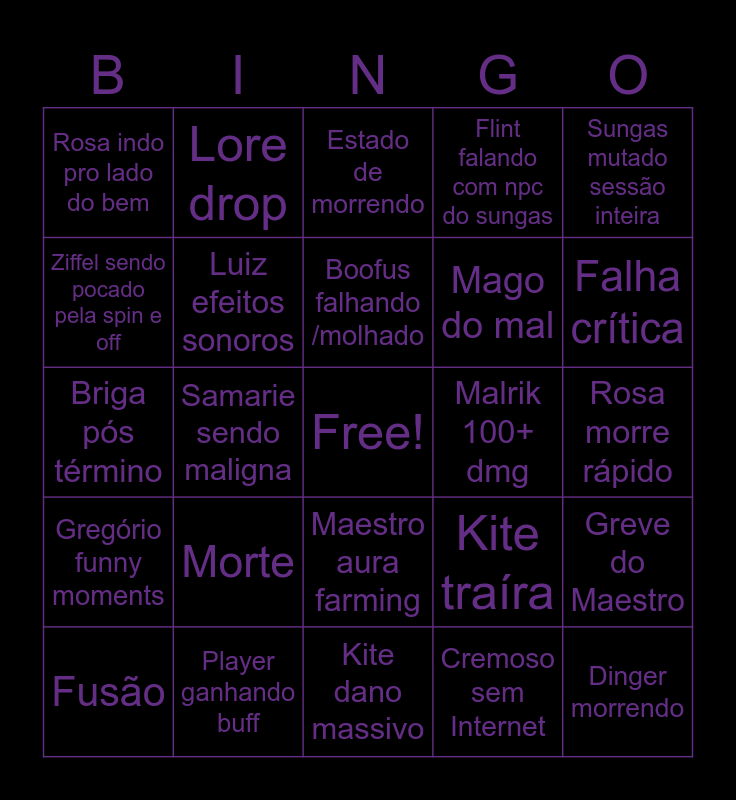 This bingo card has a free space and 24 words: Fusão, Morte, Boofus falhando /molhado, Cremoso sem Internet, Sungas mutado sessão inteira, Rosa indo pro lado do bem, Lore drop, Estado de morrendo, Malrik 100+ dmg, Rosa morre rápido, Briga pós término, Luiz efeitos sonoros, Kite traíra, Greve do Maestro, Ziffel sendo pocado pela spin e off, Player ganhando buff, Kite dano massivo, Flint falando com npc do sungas, Falha crítica, Gregório funny moments, Samarie sendo maligna, Maestro aura farming, Mago do mal and Dinger morrendo.