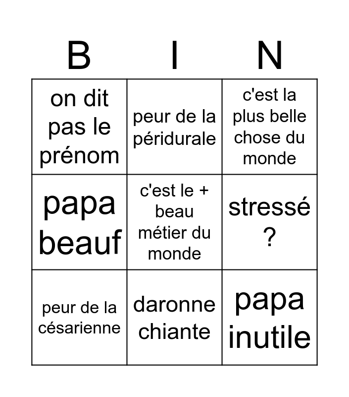 This bingo card has a free space and 8 words: stressé ?, c'est la plus belle chose du monde, peur de la péridurale, peur de la césarienne, on dit pas le prénom, papa inutile, papa beauf and daronne chiante.
