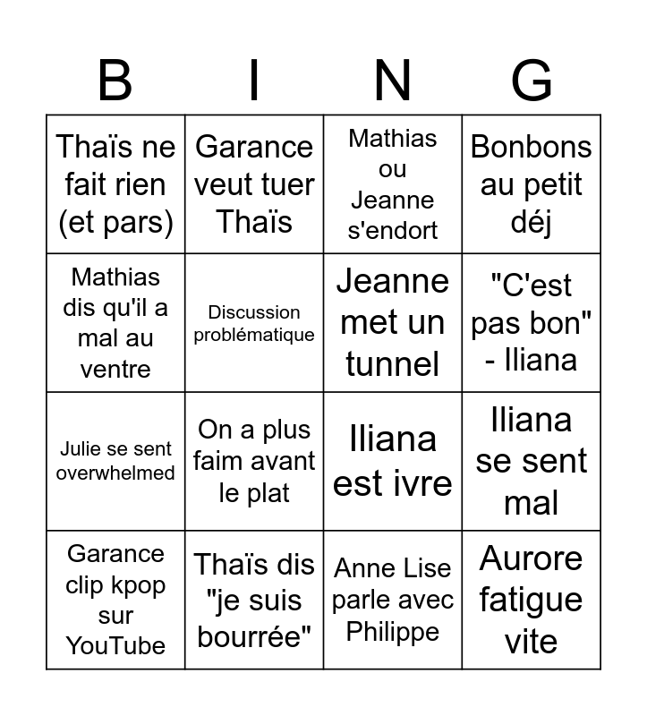 This bingo card has 16 words: Thaïs dis "je suis bourrée", Iliana se sent mal, Mathias ou Jeanne s'endort, Thaïs ne fait rien (et pars), Julie se sent overwhelmed, Garance veut tuer Thaïs, Iliana est ivre, Anne Lise parle avec Philippe, Mathias dis qu'il a mal au ventre, Discussion problématique, Garance clip kpop sur YouTube, Bonbons au petit déj, On a plus faim avant le plat, "C'est pas bon" - Iliana, Jeanne met un tunnel and Aurore fatigue vite.