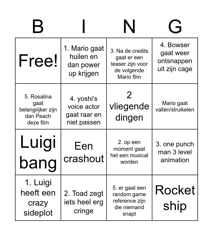 This bingo card has 16 words: 1. Luigi heeft een crazy sideplot, 2. Toad zegt iets heel erg cringe, 3. Na de credits gaat er een teaser zijn voor de volgende Mario film, 4. Bowser gaat weer ontsnappen uit zijn cage, 5. Rosalina gaat belangrijker zijn dan Peach deze film, 1. Mario gaat huilen en dan power up krijgen, 2. op een moment gaat het een musical worden, 3. one punch man 3 level animation, Free!, 4. yoshi’s voice actor gaat raar en niet passen, 5. er gaat een random game reference zijn die niemand snapt, Mario gaat vallen/struikelen, Luigi bang, Een crashout, 2 vliegende dingen and Rocket ship.