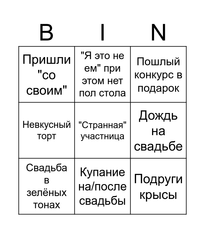 This bingo card has a free space and 8 words: Дождь на свадьбе, Пошлый конкурс в подарок, "Я это не ем" при этом нет пол стола, Свадьба в зелёных тонах, Пришли "со своим", Подруги крысы, Невкусный торт and Купание на/после свадьбы.