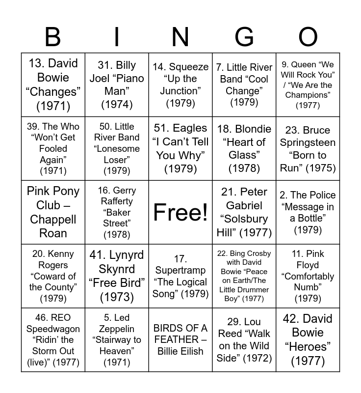 This bingo card has a free space and 69 words: 1. Styx “Renegade” (1978), 2. The Police “Message in a Bottle” (1979), 3. Styx “Come Sail Away” (1977), 4. Queen “Bohemian Rhapsody” (1975), 5. Led Zeppelin “Stairway to Heaven” (1971), 6. Pink Floyd “Another Brick in the Wall Part II” (1979), 7. Little River Band “Cool Change” (1979), 8. Styx “Fooling Yourself (Angry Young Man)” (1977), 9. Queen “We Will Rock You” / “We Are the Champions” (1977), 10. Styx “Suite Madame Blue” (1975), 11. Pink Floyd “Comfortably Numb” (1979), 12. Styx “Babe” (1979), 13. David Bowie “Changes” (1971), 14. Squeeze “Up the Junction” (1979), 15. Eagles “Hotel California” (1977), 16. Gerry Rafferty “Baker Street” (1978), 17. Supertramp “The Logical Song” (1979), 18. Blondie “Heart of Glass” (1978), 19. Eagles “Desperado” (1973), 20. Kenny Rogers “Coward of the County” (1979), 21. Peter Gabriel “Solsbury Hill” (1977), 22. Bing Crosby with David Bowie “Peace on Earth/The Little Drummer Boy” (1977), 23. Bruce Springsteen “Born to Run” (1975), 24. Pink Floyd “Mother” (1979), 25. Harry Chapin “Cat’s in the Cradle” (1974), 26. Journey “Feeling That Way” / “Anytime” (1978), 27. Chic “Le Freak” (1978), 28. Stevie Wonder “I Believe When I Fall in Love It Will Be Forever” (1972), 29. Lou Reed “Walk on the Wild Side” (1972), 30. Kenny Rogers “The Gambler” (1978), 31. Billy Joel “Piano Man” (1974), 32. Boston “More Than a Feeling” (1976), 33. Village People “Y.M.C.A.” (1978), 34. The Boomtown Rats “I Don’t Like Mondays” (1979), 35. Derek and the Dominos “Layla” (1970), 36. Eagles “Take It Easy” (1972), 37. Yes “Roundabout” (1971), 38. The Police “Roxanne” (1978), 39. The Who “Won’t Get Fooled Again” (1971), 40. Bee Gees “Stayin’ Alive” (1977), 41. Lynyrd Skynrd “Free Bird” (1973), 42. David Bowie “Heroes” (1977), 43. Andrea McCardle “Tomorrow” (1977), 44. Eagles “Heartache Tonight” (1979), 45. John Lennon “Imagine” (1971), 46. REO Speedwagon “Ridin’ the Storm Out (live)” (1977), 47. John Williams “Star Wars (Main Title)” (1977), 48. Queen “Crazy Little Thing Called Love” (1979), 49. Billy Joel “Just the Way You Are” (1977), 50. Little River Band “Lonesome Loser” (1979), 51. Eagles “I Can’t Tell You Why” (1979), 52. Meat Loaf “Paradise by the Dashboard Light” (1977), 53. Bob Seger & the Silver Bullet Band “Turn the Page (live)” (1976)Die With A Smile – Lady Gaga & Bruno Mars, BIRDS OF A FEATHER – Billie Eilish, Espresso – Sabrina Carpenter, Taste – Sabrina Carpenter, Choosin' Texas – Ella Langley, End of Beginning – Djo, Who – Jimin, Pink Pony Club – Chappell Roan, NIGHTINGALE LANE – RAYE, Risk It All – Bruno Mar, 54. Pink Floyd “Money” (1973), 55. James Taylor “Fire and Rain” (1970), 56. Aerosmith “Walk This Way” (1976), 57. James Taylor “You’ve Got a Friend” (1971), 58. Gloria Gaynor “I Will Survive” (1978), 59. Kansas “Carry on Wayward Son” (1976) and 60. Elton John “Your Song” (1970).