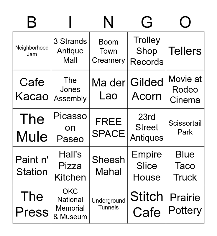 This bingo card has a free space and 24 words: Hall's Pizza Kitchen, OKC National Memorial & Museum, Ma der Lao, The Press, Tellers, Neighborhood Jam, Cafe Kacao, 3 Strands Antique Mall, 23rd Street Antiques, Sheesh Mahal, Gilded Acorn, The Mule, Empire Slice House, Blue Taco Truck, The Jones Assembly, Stitch Cafe, Scissortail Park, Boom Town Creamery, Movie at Rodeo Cinema, Picasso on Paseo, Prairie Pottery, Paint n' Station, Trolley Shop Records and Underground Tunnels.