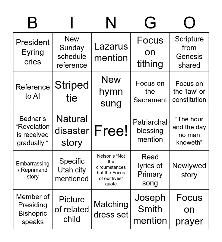 This bingo card has a free space and 24 words: Specific Utah city mentioned, Picture of related child, New hymn sung, Member of Presiding Bishopric speaks, Scripture from Genesis shared, President Eyring cries, Reference to AI, New Sunday schedule reference, Patriarchal blessing mention, Nelson’s “Not the circumstances but the Focus of our lives” quote, Focus on the Sacrament, Bednar’s “Revelation is received gradually “, Read lyrics of Primary song, Newlywed story, Striped tie, Joseph Smith mention, “The hour and the day no man knoweth”, Lazarus mention, Focus on the ‘law’ or constitution, Natural disaster story, Focus on prayer, Embarrassing / Reprimand story, Focus on tithing and Matching dress set.