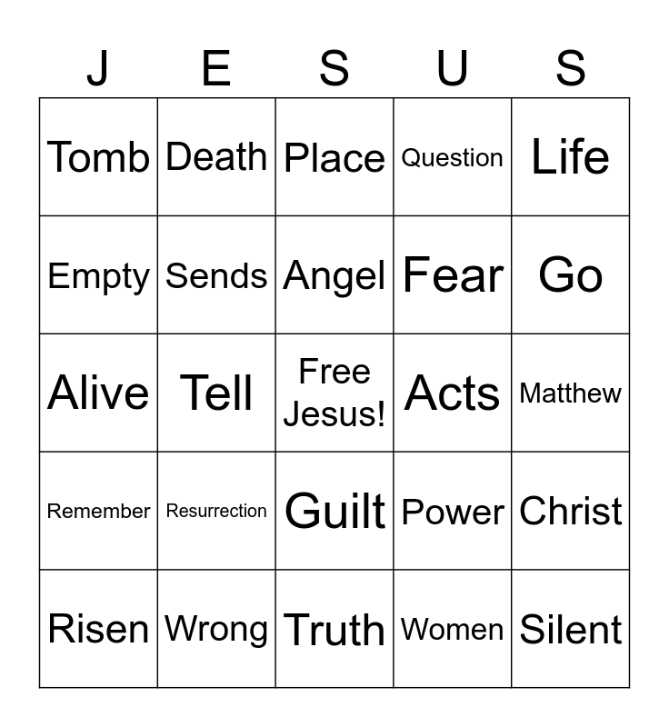 This bingo card has a free space and 24 words: Resurrection, Wrong, Angel, Risen, Life, Tomb, Empty, Death, Acts, Guilt, Fear, Alive, Power, Christ, Sends, Women, Matthew, Place, Go, Tell, Silent, Remember, Question and Truth.