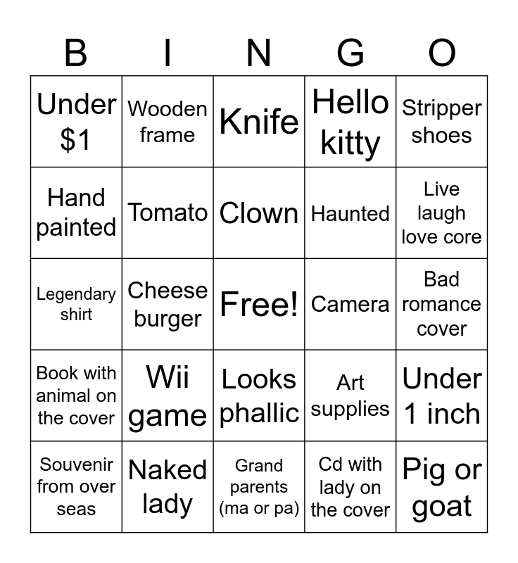 This bingo card has a free space and 24 words: Wii game, Naked lady, Clown, Souvenir from over seas, Stripper shoes, Under $1, Hand painted, Wooden frame, Camera, Looks phallic, Haunted, Legendary shirt, Art supplies, Under 1 inch, Tomato, Cd with lady on the cover, Bad romance cover, Knife, Live laugh love core, Cheese burger, Pig or goat, Book with animal on the cover, Hello kitty and Grand parents (ma or pa).