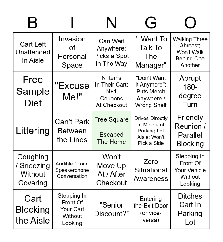 This bingo card has a free space and 24 words: Audible / Loud Speakerphone Conversation, Stepping In Front Of Your Cart Without Looking, N Items In Their Cart; N+1 Coupons At Checkout, Cart Blocking the Aisle, Walking Three Abreast; Won't Walk Behind One Another, Cart Left Unattended In Aisle, Free Sample Diet, Invasion of Personal Space, Drives Directly In Middle of Parking Lot Aisle; Won't Pick a Side, Won't Move Up At / After Checkout, "Don't Want It Anymore"; Puts Merch Anywhere / Wrong Shelf, Littering, Zero Situational Awareness, Stepping In Front Of Your Vehicle Without Looking, "Excuse Me!", Entering the Exit Door (or vice-versa), Friendly Reunion / Parallel Blocking, Can Wait Anywhere; Picks a Spot In The Way, Abrupt 180-degree Turn, Can't Park Between the Lines, Ditches Cart In Parking Lot, Coughing / Sneezing Without Covering, "I Want To Talk To The Manager" and "Senior Discount?".