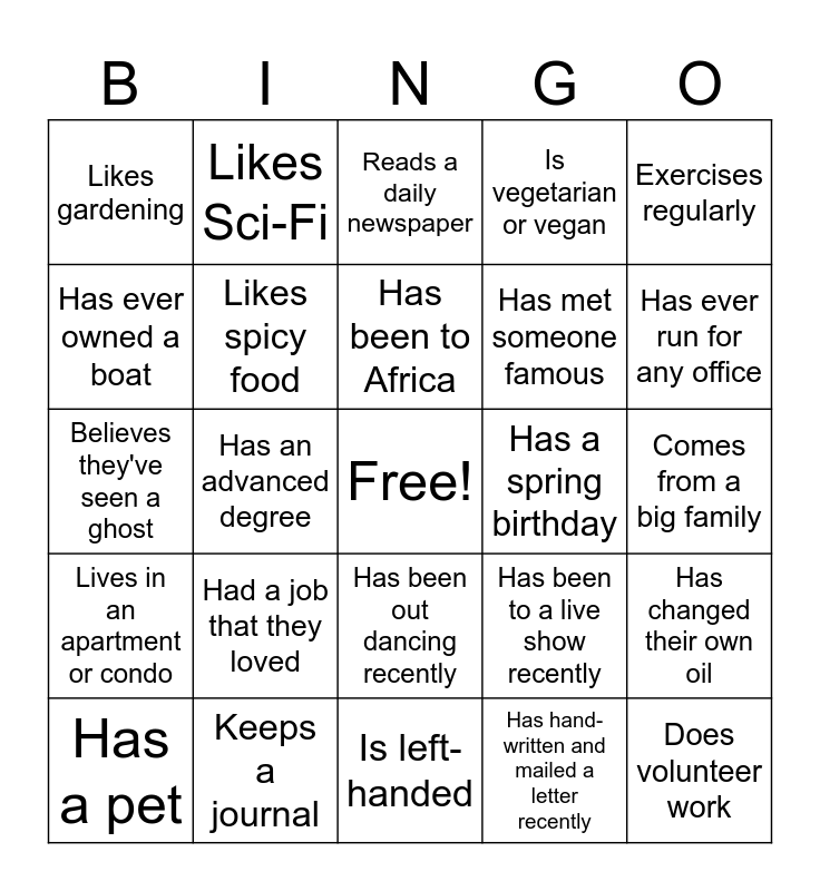 This bingo card has a free space and 39 words: Speaks another language, Plays a musical instrument, Has children, Likes spicy food, Has a pet, Has been out dancing recently, Has been to Africa, Has witnessed a space launch, Exercises regularly, Lives in an apartment or condo, Has an advanced degree, Is vegetarian or vegan, Does volunteer work, Comes from a big family, Has a spring birthday, Had a job that they loved, Has acted in a play, Likes gardening, Writes poetry, Has been to a live show recently, Has ever owned a boat, Is left-handed, Has met someone famous, Has ever run for any office, Has a fish tank, Has worked in the food or restaurant business, Has lived overseas, Enjoys the beach, Has never flown on a plane, Likes Sci-Fi, Has been to a movie in the past few weeks, Has eaten at a sit down restaurant recently, Reads a daily newspaper, Keeps a journal, Has hand-written and mailed a letter recently, Has broken a bone, Has changed their own oil, Believes they've seen a ghost and Has ever won big at a casino.