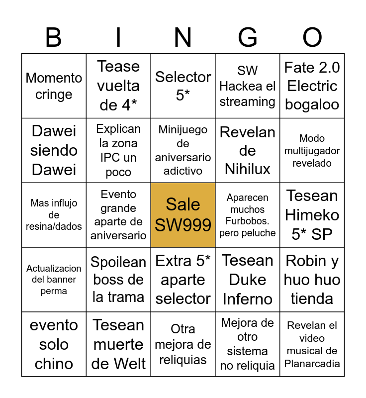 This bingo card has a free space and 24 words: Spoilean boss de la trama, Tesean muerte de Welt, Minijuego de aniversario adictivo, evento solo chino, Fate 2.0 Electric bogaloo, Momento cringe, Dawei siendo Dawei, Tease vuelta de 4*, Aparecen muchos Furbobos. pero peluche, Extra 5* aparte selector, Revelan de Nihilux, Mas influjo de resina/dados, Tesean Duke Inferno, Robin y huo huo tienda, Explican la zona IPC un poco, Mejora de otro sistema no reliquia, Tesean Himeko 5* SP, Selector 5*, Modo multijugador revelado, Evento grande aparte de aniversario, Revelan el video musical de Planarcadia, Actualizacion del banner perma, SW Hackea el streaming and Otra mejora de reliquias.