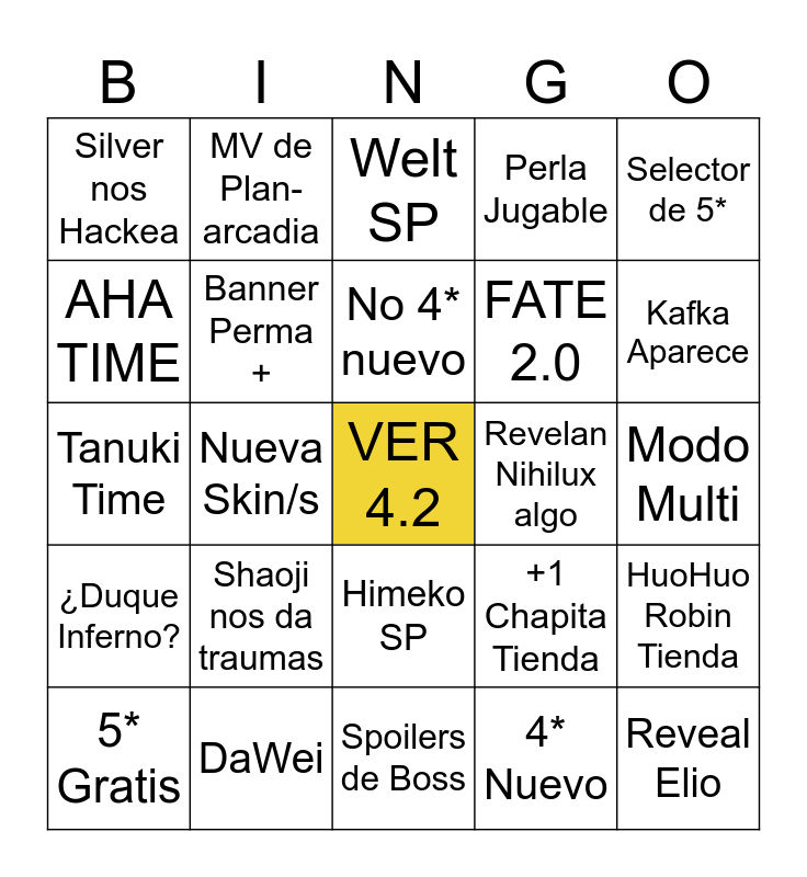 This bingo card has a free space and 24 words: Shaoji nos da traumas, DaWei, No 4* nuevo, 5* Gratis, Selector de 5*, Silver nos Hackea, AHA TIME, MV de Plan-arcadia, Revelan Nihilux algo, Himeko SP, FATE 2.0, Tanuki Time, +1 Chapita Tienda, HuoHuo Robin Tienda, Banner Perma +, 4* Nuevo, Modo Multi, Welt SP, Kafka Aparece, Nueva Skin/s, Reveal Elio, ¿Duque Inferno?, Perla Jugable and Spoilers de Boss.