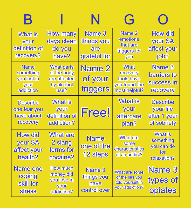 This bingo card has a free space and 24 words: What are 2 slang terms for cocaine?, How much money did you lose in your addiction?, Name 2 of your triggers, Name one coping skill for stress, How did your SA affect your job?, What is your definition of recovery?, Name something you lost in your addiction, How many days clean do you have?, What is your aftercare plan?, Name one of the 12 steps, What recovery tools have you found the most helpful?, Describe one fear you have about recovery, What are some characteristics of an addict?, What is something you can do for relaxation?, What parts of the body are affected by alcohol use?, What are some of the lies you told yourself in your addiction?, Describe your life after 1 year of sobriety, Name 3 things you are grateful for, Name 3 barriers to success in recovery, What is your definition of addiction?, Name 3 types of opiates, How did your SA affect your health?, Name 2 emotions that are triggers for you and Name 3 things you have control over.