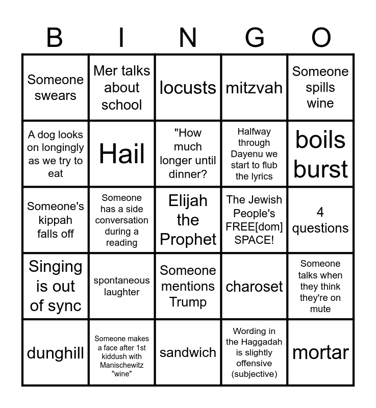 This bingo card has a free space and 24 words: spontaneous laughter, Someone makes a face after 1st kiddush with Manischewitz "wine", "How much longer until dinner?, dunghill, Someone spills wine, Someone swears, A dog looks on longingly as we try to eat, Mer talks about school, The Jewish People's FREE[dom] SPACE!, Someone mentions Trump, Halfway through Dayenu we start to flub the lyrics, Someone's kippah falls off, charoset, Someone talks when they think they're on mute, Hail, Wording in the Haggadah is slightly offensive (subjective), 4 questions, locusts, boils burst, Someone has a side conversation during a reading, mortar, Singing is out of sync, mitzvah and sandwich.