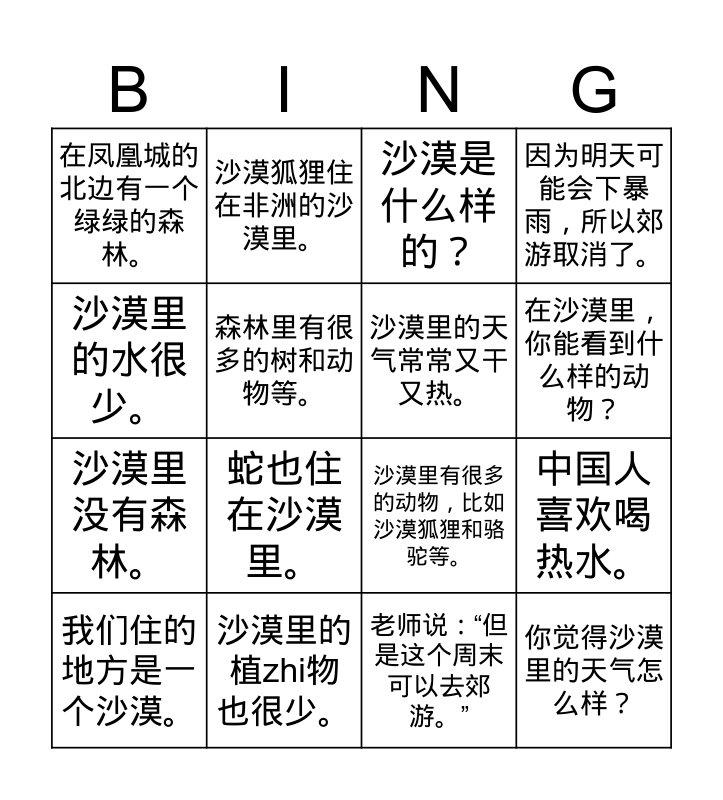 This bingo card has 20 words: 中国人喜欢喝热水。, 沙漠里有什么?, 沙漠是什么样的?, 沙漠里有很多的沙子。, 我们住的地方是一个沙漠。, 沙漠里的水很少。, 沙漠里的植zhi物也很少。, 在凤凰城的北边有一个绿绿的森林。, 沙漠里没有森林。, 沙漠狐狸住在非洲的沙漠里。, 蛇也住在沙漠里。, 沙漠里有很多的动物,比如沙漠狐狸和骆驼等。, 森林里有很多的树和动物等。, 你觉得沙漠里的天气怎么样?, 沙漠里的天气常常又干又热。, 沙漠里有很多的仙人掌。, 在沙漠里,你能看到什么样的动物?, 因为明天可能会下暴雨,所以郊游取消了。, 老师说:“但是这个周末可以去郊游。” and 同学问:“是不是考试取消了?”.