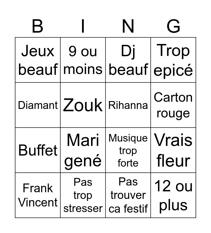 This bingo card has 16 words: Pas trop stresser, Vrais fleur, Dj beauf, Jeux beauf, Buffet, 9 ou moins, Musique trop forte, Pas trouver ca festif, Diamant, Zouk, Frank Vincent, Trop epicé, Mari gené, Carton rouge, Rihanna and 12 ou plus.