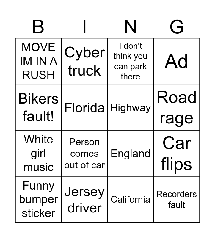 This bingo card has 16 words: Jersey driver, Car flips, I don’t think you can park there, MOVE IM IN A RUSH, White girl music, Cyber truck, England, California, Bikers fault!, Florida, Funny bumper sticker, Ad, Person comes out of car, Road rage, Highway and Recorders fault.