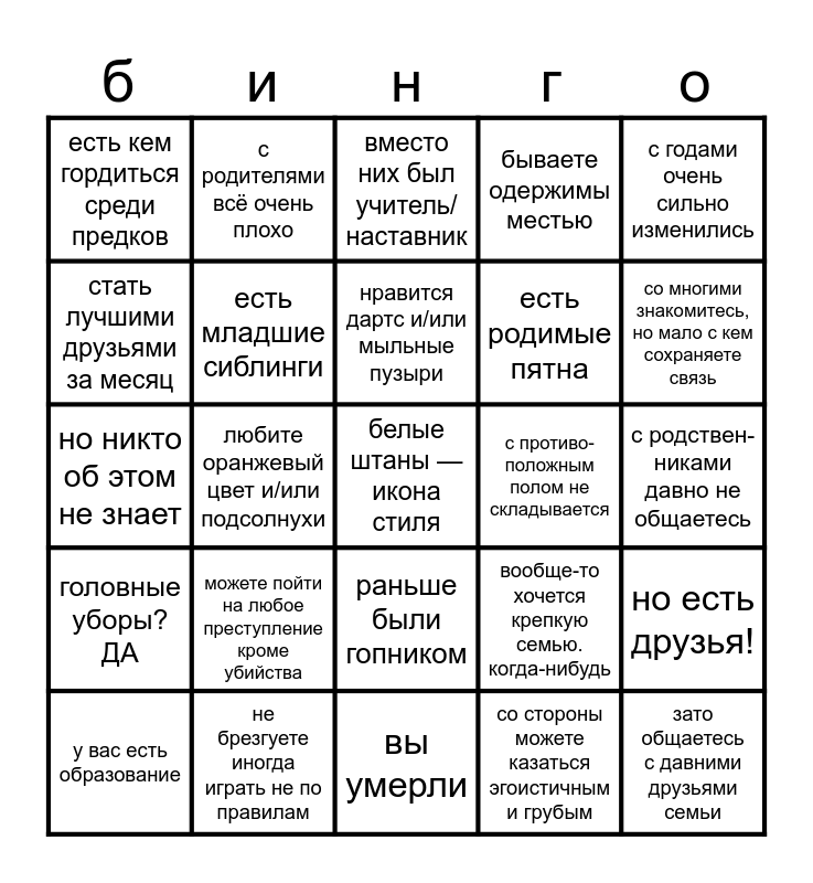 This bingo card has 25 words: головные уборы? ДА, не брезгуете иногда играть не по правилам, белые штаны — икона стиля, со стороны можете казаться эгоистичным и грубым, с годами очень сильно изменились, есть кем гордиться среди предков, с родителями всё очень плохо, вместо них был учитель/наставник, с противо-положным полом не складывается, но есть друзья!, стать лучшими друзьями за месяц, есть младшие сиблинги, вы умерли, вообще-то хочется крепкую семью. когда-нибудь, со многими знакомитесь, но мало с кем сохраняете связь, у вас есть образование, любите оранжевый цвет и/или подсолнухи, нравится дартс и/или мыльные пузыри, есть родимые пятна, с родствен-никами давно не общаетесь, но никто об этом не знает, можете пойти на любое преступление кроме убийства, раньше были гопником, бываете одержимы местью and зато общаетесь с давними друзьями семьи.