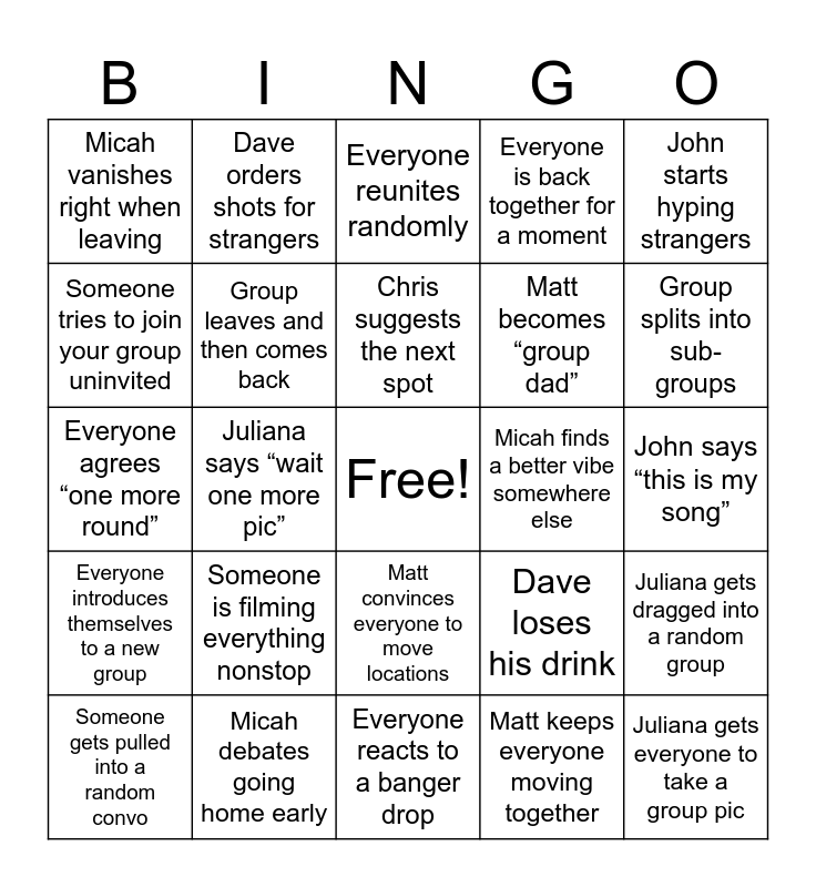 This bingo card has a free space and 100 words: Juliana makes a bathroom best friend, Micah disappears for 30+ minutes, John says “this is my song”, Dave orders something way too strong, Matt starts a deep convo mid-club, Chris rallies “one more drink”, Juliana fixes someone’s outfit/makeup, Micah is outside while everyone’s inside, John sings loudly (wrong lyrics), Dave spills a drink, Matt checks the time in disbelief, Chris organizes a group photo, Juliana pulls someone onto the dance floor, Micah debates going home early, John tries to talk to the DJ, Dave disappears with random people, Matt becomes “group dad”, Chris gets stuck in a long convo, Juliana takes 5+ photos of the same pose, Micah comes back with a wild story, John buys a round, Dave says “I’m good” (he’s not), Matt suggests food too early, Chris tracks everyone’s location, Juliana gets complimented, Micah finds a better vibe somewhere else, John starts hyping strangers, Dave loses his drink, Matt says “we should do this more often”, Chris checks in on everyone, Juliana says “wait one more pic”, Micah vanishes right when leaving, John high-fives strangers, Dave becomes best friends with someone instantly, Matt keeps everyone moving together, Chris suggests the next spot, Juliana gets dragged into a random group, Micah ends up talking to security or staff, John repeats the same joke, Dave needs water ASAP, Matt coordinates rides, Chris is still going strong late, Everyone agrees “one more round”, Everyone loses track of time, Group splits into sub-groups, Everyone reunites randomly, Everyone is shouting to communicate, Group decides to stay longer than planned, Everyone crowds for a photo, Everyone reacts to a banger drop, Everyone complains about the bar line, Everyone debates leaving vs staying, Everyone ends up outside at some point, Everyone agrees to get food after, Everyone cheers together, Everyone gets pushed on the dance floor, Everyone laughs at something dumb, Everyone gets quieter for 5 mins (rare), Everyone loses someone briefly, Everyone is back together for a moment, Someone drops a drink and doesn’t clean it, Someone is clearly way too drunk, Someone argues with a bouncer, Someone cuts the line aggressively, Someone is crying in the bathroom, Someone is barefoot, Someone knocks into your group hard, Someone is making out aggressively nearby, Someone spills a drink on the group, Someone is vaping directly into the crowd, Someone tries to start drama, Someone is filming everything nonstop, Someone is dancing on something they shouldn’t, Someone asks “who are you guys?” repeatedly, Someone gets kicked out, Someone drops their phone, Someone is yelling over nothing, Someone tries to join your group uninvited, Someone is clearly on a different planet, Everyone takes a shot together, John starts a chant, Juliana gets everyone to take a group pic, Chris organizes a round for the table, Matt convinces everyone to move locations, Micah brings in a random new person, Dave orders shots for strangers, Everyone cheers with strangers, Someone gets convinced to dance, Group starts a mini dance circle, Everyone introduces themselves to a new group, Someone buys a round for your group, Group does a synchronized “cheers” video, Everyone switches drinks for one sip, Someone gets pulled into a random convo, Group leaves and then comes back, Everyone agrees to stay “10 more minutes”, Group orders water together (survival mode), Everyone takes a selfie with strangers, Someone convinces the group to go somewhere else and Everyone ends the night with food plans.