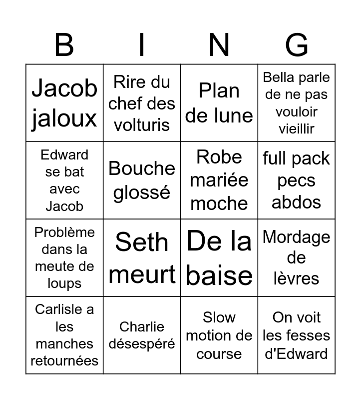 This bingo card has 16 words: Charlie désespéré, Mordage de lèvres, Plan de lune, Jacob jaloux, Problème dans la meute de loups, Rire du chef des volturis, De la baise, Slow motion de course, Edward se bat avec Jacob, Bouche glossé, Carlisle a les manches retournées, Bella parle de ne pas vouloir vieillir, Seth meurt, full pack pecs abdos, Robe mariée moche and On voit les fesses d'Edward.