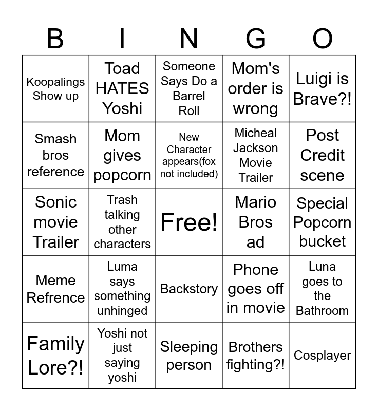 This bingo card has a free space and 24 words: Luma says something unhinged, Yoshi not just saying yoshi, New Character appears(fox not included), Family Lore?!, Luigi is Brave?!, Koopalings Show up, Smash bros reference, Toad HATES Yoshi, Mario Bros ad, Backstory, Micheal Jackson Movie Trailer, Sonic movie Trailer, Phone goes off in movie, Luna goes to the Bathroom, Mom gives popcorn, Brothers fighting?!, Special Popcorn bucket, Someone Says Do a Barrel Roll, Post Credit scene, Trash talking other characters, Cosplayer, Meme Refrence, Mom's order is wrong and Sleeping person.