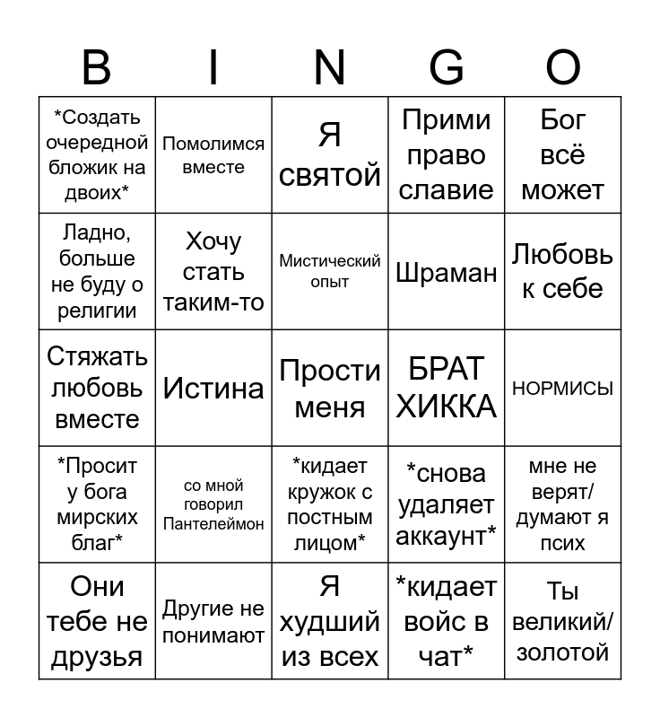This bingo card has a free space and 24 words: со мной говорил Пантелеймон, Другие не понимают, Мистический опыт, Они тебе не друзья, Бог всё может, *Создать очередной бложик на двоих*, Ладно, больше не буду о религии, Помолимся вместе, БРАТ ХИККА, *кидает кружок с постным лицом*, Шраман, Стяжать любовь вместе, *снова удаляет аккаунт*, мне не верят/ думают я псих, Хочу стать таким-то, *кидает войс в чат*, НОРМИСЫ, Я святой, Любовь к себе, Истина, Ты великий/золотой, *Просит у бога мирских благ*, Прими право славие and Я худший из всех.