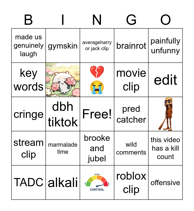 This bingo card has 3 images, a free space and 21 words: marmalade time, alkali, 💔ðŸ˜, TADC, painfully unfunny, made us genuinely laugh, key words, gymskin, pred catcher, brooke and jubel, movie clip, cringe, wild comments, this video has a kill count, roblox clip, averageharry or jack clip, edit, dbh tiktok, offensive, stream clip and brainrot.