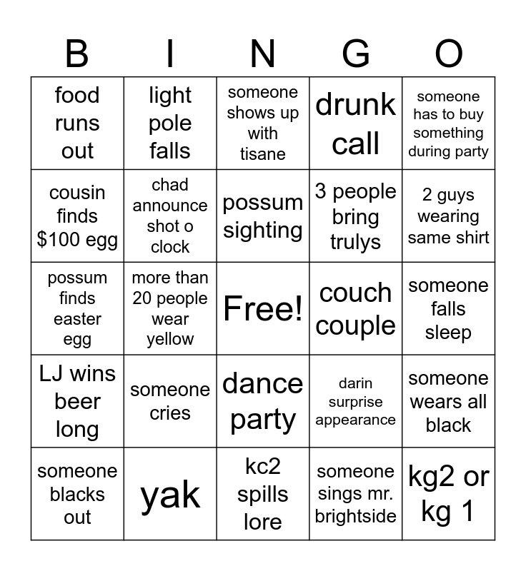 This bingo card has a free space and 24 words: someone cries, yak, possum sighting, someone blacks out, someone has to buy something during party, food runs out, cousin finds $100 egg, light pole falls, couch couple, dance party, 3 people bring trulys, possum finds easter egg, darin surprise appearance, someone wears all black, chad announce shot o clock, someone sings mr. brightside, someone falls sleep, someone shows up with tisane, 2 guys wearing same shirt, more than 20 people wear yellow, kg2 or kg 1, LJ wins beer long, drunk call and kc2 spills lore.