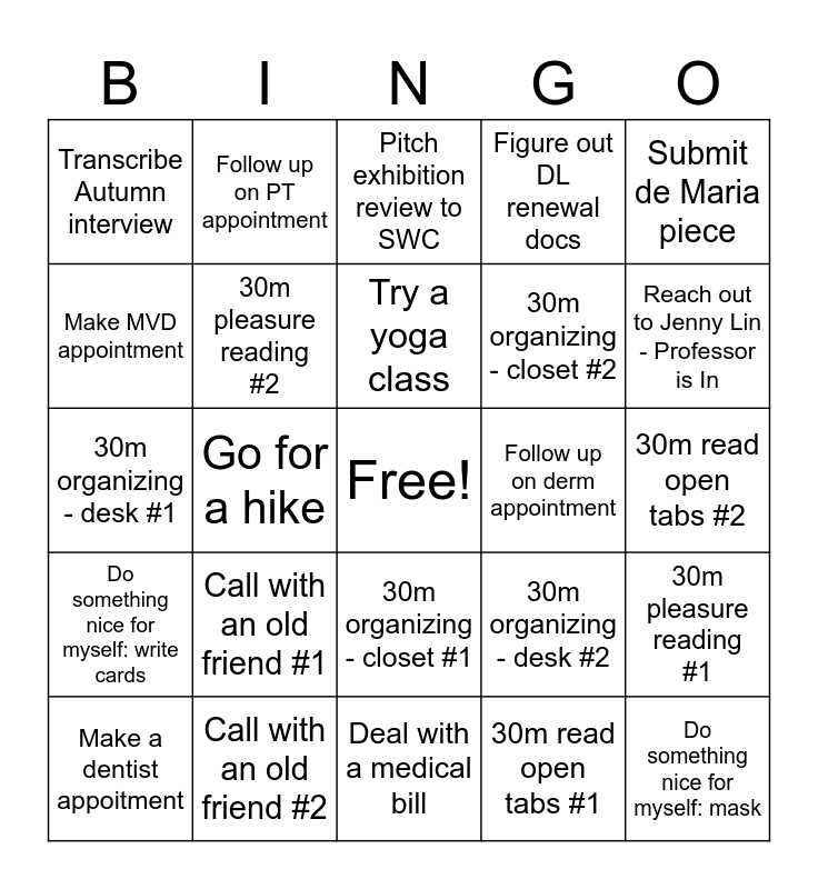 This bingo card has a free space and 24 words: Call with an old friend #1, Call with an old friend #2, Try a yoga class, Make a dentist appoitment, Submit de Maria piece, Transcribe Autumn interview, Make MVD appointment, Follow up on PT appointment, Follow up on derm appointment, 30m organizing - closet #1, 30m organizing - closet #2, 30m organizing - desk #1, 30m organizing - desk #2, 30m pleasure reading #1, 30m pleasure reading #2, 30m read open tabs #1, 30m read open tabs #2, Pitch exhibition review to SWC, Reach out to Jenny Lin - Professor is In, Go for a hike, Do something nice for myself: mask, Do something nice for myself: write cards, Figure out DL renewal docs and Deal with a medical bill.