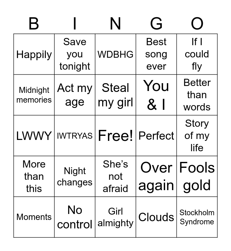 This bingo card has a free space and 32 words: Clouds, Strong, IWTRYAS, What a feeling, More than this, Act my age, If I could fly, Fools gold, Save you tonight, Fireproof, Steal my girl, WDBHG, Little things, Diana, Perfect, Infinity, Moments, LWWY, She’s not afraid, Night changes, Over again, History, Story of my life, No control, Stockholm Syndrome, Best song ever, You & I, Midnight memories, Happily, Girl almighty, Alive and Better than words.