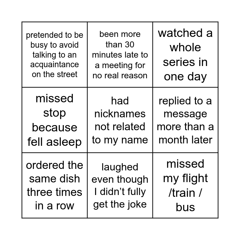 This bingo card has 9 words: ordered the same dish three times in a row, watched a whole series in one day, been more than 30 minutes late to a meeting for no real reason, missed stop because fell asleep, pretended to be busy to avoid talking to an acquaintance on the street, replied to a message more than a month later, had nicknames not related to my name, missed my flight /train / bus and laughed even though I didn’t fully get the joke.