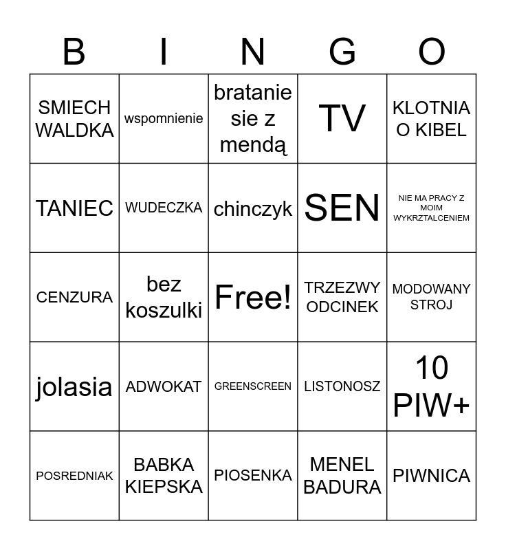 This bingo card has a free space and 24 words: ADWOKAT, BABKA KIEPSKA, chinczyk, POSREDNIAK, KLOTNIA O KIBEL, SMIECH WALDKA, TANIEC, wspomnienie, TRZEZWY ODCINEK, GREENSCREEN, SEN, CENZURA, LISTONOSZ, 10 PIW+, WUDECZKA, MENEL BADURA, MODOWANY STROJ, bratanie sie z mendą, NIE MA PRACY Z MOIM WYKRZTALCENIEM, bez koszulki, PIWNICA, jolasia, TV and PIOSENKA.