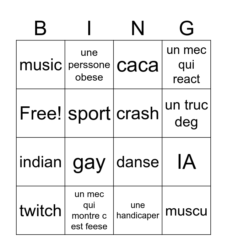 This bingo card has 16 words: un mec qui montre c est feese, IA, caca, music, indian, une perssone obese, danse, une handicaper, Free!, sport, twitch, un mec qui react, gay, un truc deg, crash and muscu.