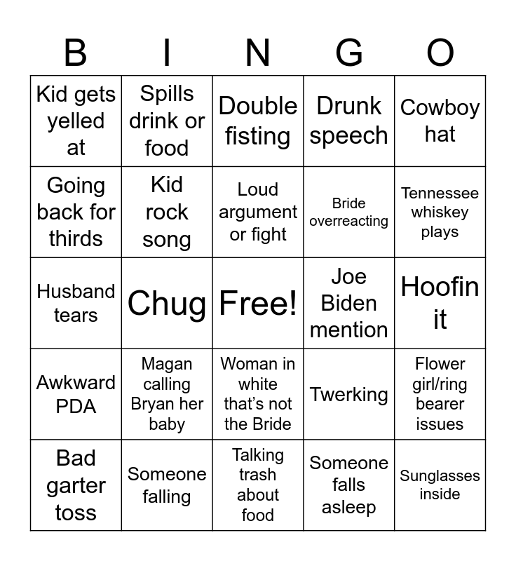 This bingo card has a free space and 28 words: Flower girl/ring bearer issues, MAGA hat, Bride overreacting, Someone falls asleep, Going back for thirds, Double fisting, Spills drink or food, Awkward PDA, Joe Biden mention, Bad garter toss, Husband tears, Drunk speech, Someone falling, Talking trash about food, Tennessee whiskey plays, Nana saying she can’t hear, Magan calling Bryan her baby, Kid rock song, Loud argument or fight, Woman in white that’s not the Bride, Kid gets yelled at, Mullet, Sunglasses inside, Chug, Hoofin it, Twerking, Cowboy hat and Puking.