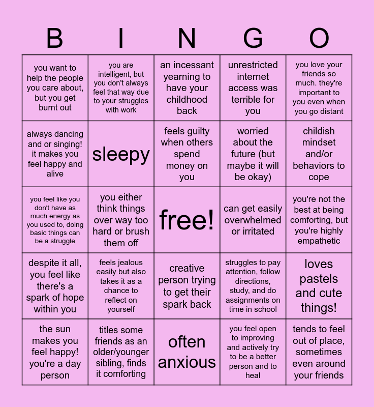 This bingo card has a free space and 24 words: feels jealous easily but also takes it as a chance to reflect on yourself, titles some friends as an older/younger sibling, finds it comforting, feels guilty when others spend money on you, the sun makes you feel happy! you're a day person, you love your friends so much. they're important to you even when you go distant, you want to help the people you care about, but you get burnt out, always dancing and or singing! it makes you feel happy and alive, you are intelligent, but you don't always feel that way due to your struggles with work, can get easily overwhelmed or irritated, creative person trying to get their spark back, worried about the future (but maybe it will be okay), you feel like you don't have as much energy as you used to, doing basic things can be a struggle, struggles to pay attention, follow directions, study, and do assignments on time in school, loves pastels and cute things!, sleepy, you feel open to improving and actively try to be a better person and to heal, you're not the best at being comforting, but you're highly empathetic, an incessant yearning to have your childhood back, childish mindset and/or behaviors to cope, you either think things over way too hard or brush them off, tends to feel out of place, sometimes even around your friends, despite it all, you feel like there's a spark of hope within you, unrestricted internet access was terrible for you and often anxious.