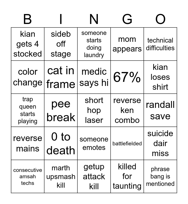 This bingo card has a free space and 24 words: 0 to death, marth upsmash kill, medic says hi, consecutive amsah techs, technical difficulties, kian gets 4 stocked, color change, sideb off stage, reverse ken combo, someone emotes, 67%, trap queen starts playing, battlefielded, suicide dair miss, cat in frame, killed for taunting, randall save, someone starts doing laundry, kian loses shirt, pee break, phrase bang is mentioned, reverse mains, mom appears and getup attack kill.