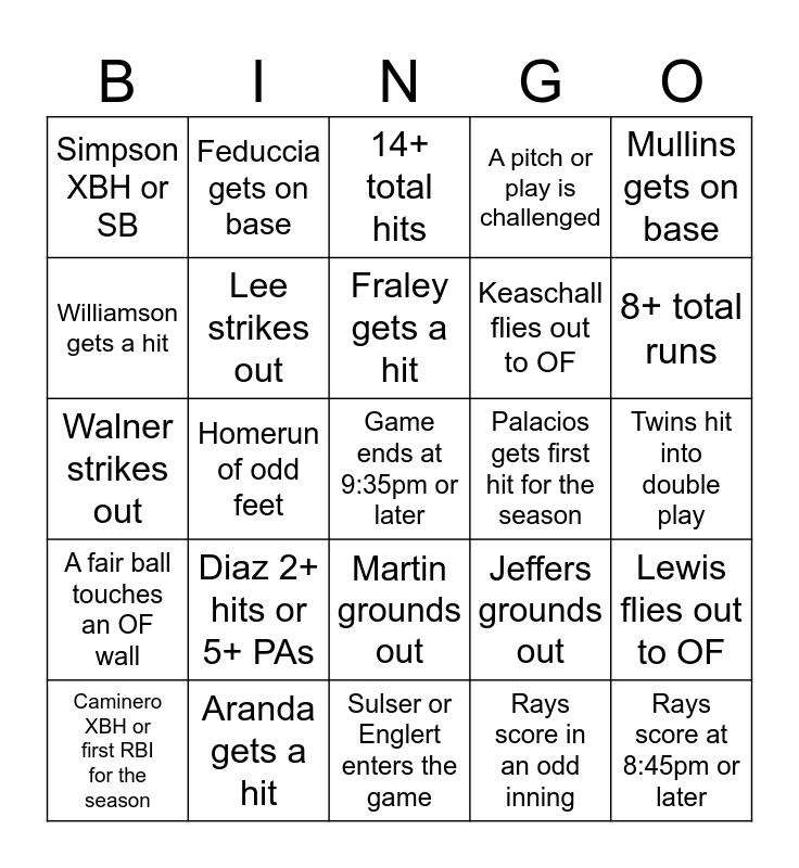 This bingo card has a free space and 24 words: Diaz 2+ hits or 5+ PAs, Aranda gets a hit, Fraley gets a hit, Caminero XBH or first RBI for the season, Mullins gets on base, Simpson XBH or SB, Williamson gets a hit, Feduccia gets on base, Palacios gets first hit for the season, Martin grounds out, Keaschall flies out to OF, Walner strikes out, Jeffers grounds out, Lewis flies out to OF, Lee strikes out, Rays score in an odd inning, Twins hit into double play, 14+ total hits, 8+ total runs, Homerun of odd feet, Rays score at 8:45pm or later, A fair ball touches an OF wall, A pitch or play is challenged and Sulser or Englert enters the game.