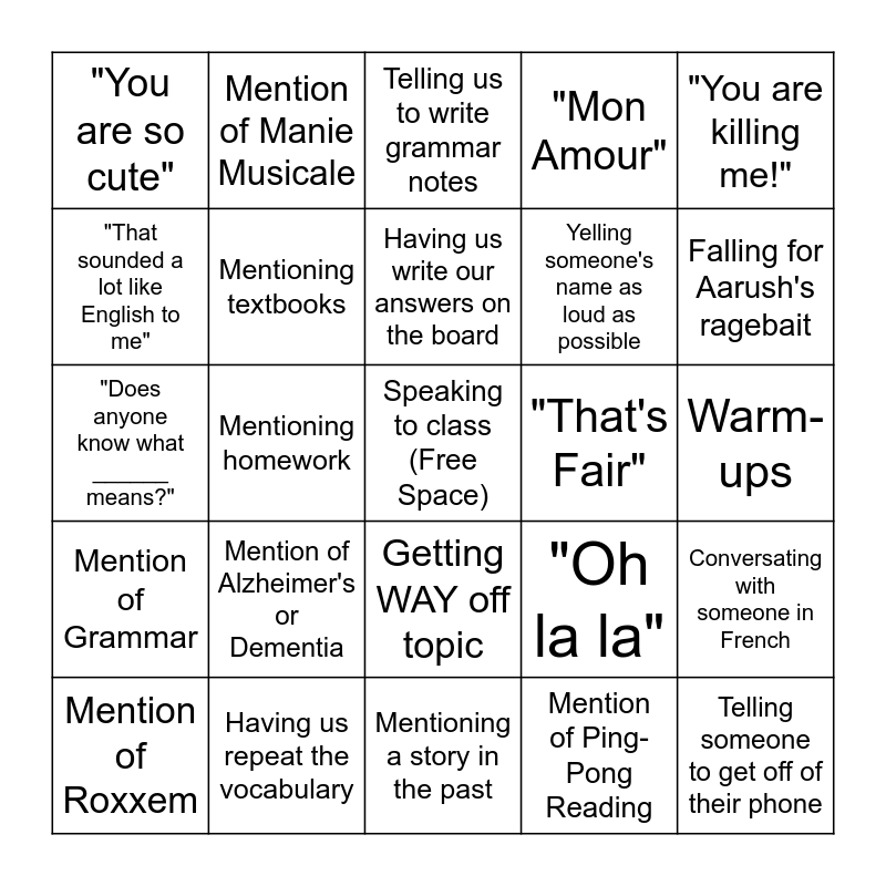 This bingo card has a free space and 24 words: Mention of Alzheimer's or Dementia, Having us repeat the vocabulary, Having us write our answers on the board, Mention of Roxxem, "You are killing me!", "You are so cute", "That sounded a lot like English to me", Mention of Manie Musicale, "That's Fair", Getting WAY off topic, Yelling someone's name as loud as possible, "Does anyone know what ______ means?", "Oh la la", Conversating with someone in French, Mentioning textbooks, Mention of Ping-Pong Reading, Warm-ups, Telling us to write grammar notes, Falling for Aarush's ragebait, Mentioning homework, Telling someone to get off of their phone, Mention of Grammar, "Mon Amour" and Mentioning a story in the past.