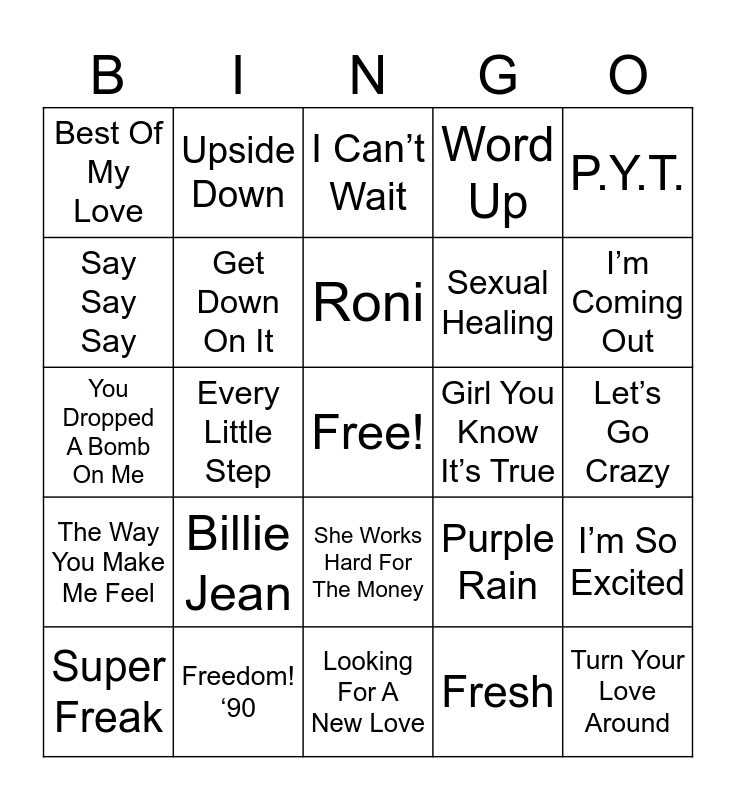 This bingo card has a free space and 48 words: I Knew You Were Waiting, Turn Your Love Around, Forever Your Girl, Looking For A New Love, Billie Jean, I Would Die 4U, Upside Down, Slow Hand, Say Say Say, Celebration, Get Down On It, Word Up, I’m So Excited, Purple Rain, Dirty Diana, I Wonder If I Take You Home, Roni, Girl You Know It’s True, How Will I Know, P.Y.T., Every Little Step, Fresh, Best Of My Love, Sexual Healing, Yeah!, I’m Coming Out, Super Freak, Physical, She Works Hard For The Money, The Way You Make Me Feel, I Wanna Dance With Somebody, Le Freak, Bad Girls, Lovely Day, Freedom! ‘90, Don’t Go Breaking My Heart, Let’s Get It On, Let’s Go Crazy, I Will Survive, Everything She Wants, Shake Your Body ( Down to the…., Automatic, I Can’t Wait, Father Figure, You Dropped A Bomb On Me, Ice Ice Baby, Pump Up The Jam and Good Vibrations.