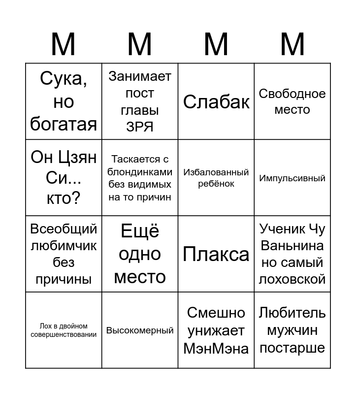 This bingo card has 16 words: Высокомерный, Ученик Чу Ваньнина но самый лоховской, Слабак, Сука, но богатая, Всеобщий любимчик без причины, Занимает пост главы ЗРЯ, Плакса, Смешно унижает МэнМэна, Он Цзян Си... кто?, Таскается с блондинками без видимых на то причин, Лох в двойном совершенствовании, Свободное место, Ещё одно место, Импульсивный, Избалованный ребёнок and Любитель мужчин постарше.