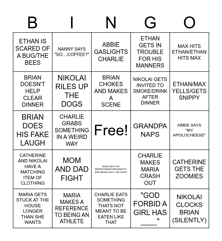 This bingo card has a free space and 25 words: MOM AND DAD FIGHT, CHARLIE EATS SOMETHING THATS NOT MEANT TO BE EATEN LIKE THAT, BRIAN CHOKES AND MAKES A SCENE, MARIA GETS STUCK AT THE HOUSE LONGER THAN SHE WANTS, MAX HITS ETHAN/ETHAN HITS MAX, ETHAN IS SCARED OF A BUG/THE BEES, BRIAN DOESN'T HELP CLEAR DINNER, NANNY SAYS "SO....COFFEE?", GRANDPA NAPS, MOM SAYS "MY BEDROOM/BATHROOM/ETC" AND BRIAN SAYS "UM OURS", NIKOLAI GETS INVITED TO SMOKE/DRINK AFTER DINNER, BRIAN DOES HIS FAKE LAUGH, CHARLIE MAKES MARIA CRASH OUT, CATHERINE GETS THE ZOOMIES, NIKOLAI RILES UP THE DOGS, SOMEONE SUGGESTS SHOTS, ABBIE SAYS "MY APOLOCHEESE", ABBIE GASLIGHTS CHARLIE, ETHAN/MAX YELLS/GETS SNIPPY, CHARLIE GRABS SOMETHING IN A WEIRD WAY, NIKOLAI CLOCKS BRIAN (SILENTLY), MARIA MAKES A REFERENCE TO BEING AN ATHLETE, CATHERINE AND NIKOLAI HAVE A MATCHING ITEM OF CLOTHING, ETHAN GETS IN TROUBLE FOR HIS MANNERS and "GOD FORBID A GIRL HAS ____".
