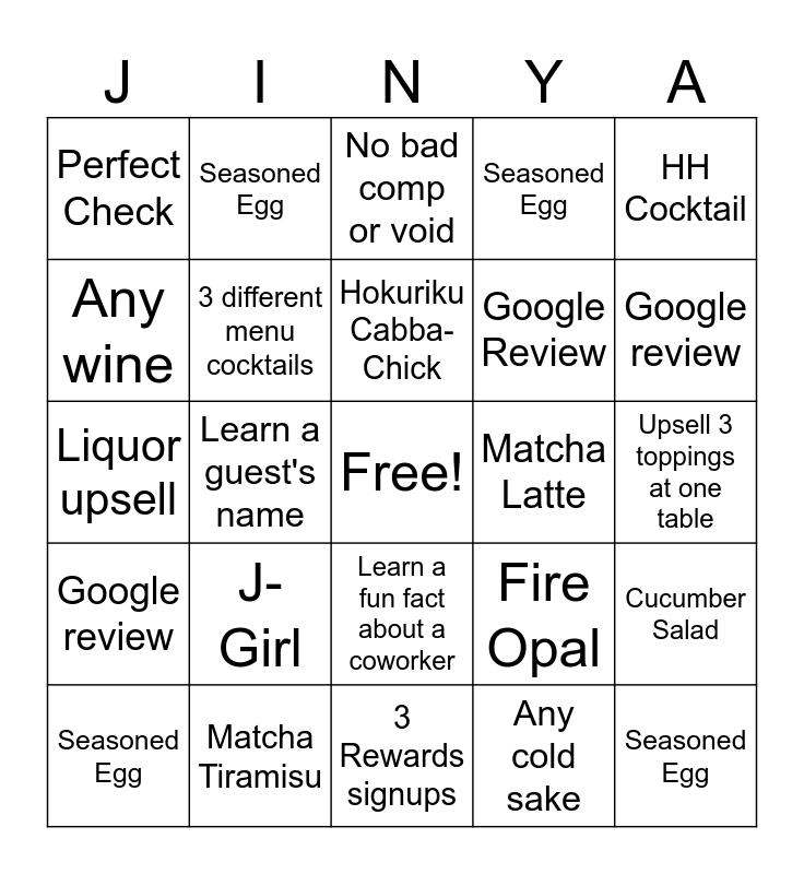 This bingo card has a free space and 24 words: Seasoned Egg, J-Girl, Hokuriku Cabba-Chick, Any cold sake, HH Cocktail, Perfect Check, Seasoned Egg, No bad comp or void, Matcha Latte, Upsell 3 toppings at one table, Liquor upsell, 3 different menu cocktails, Fire Opal, Cucumber Salad, Any wine, Matcha Tiramisu, 3 Rewards signups, Seasoned Egg, Google review, Google review, Learn a guest's name, Learn a fun fact about a coworker, Google Review and Seasoned Egg.