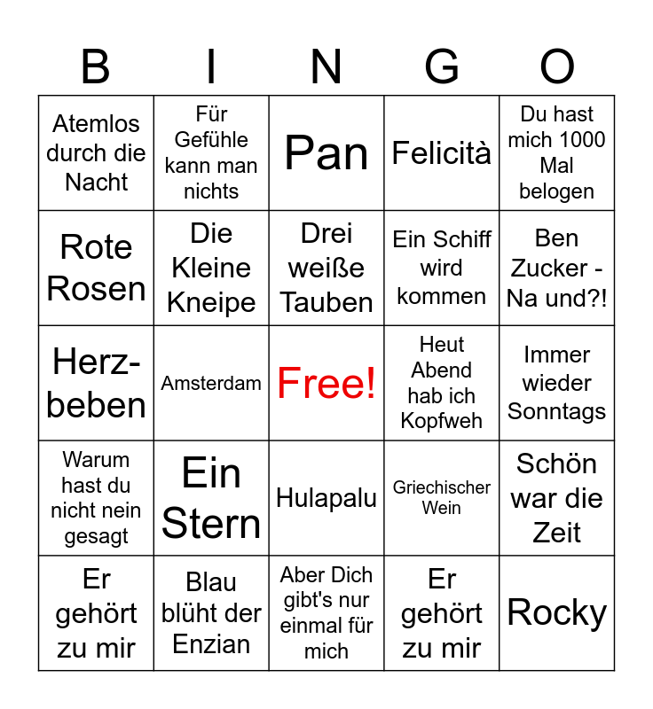This bingo card has a free space and 24 words: Ein Stern, Blau blüht der Enzian, Drei weiße Tauben, Er gehört zu mir, Du hast mich 1000 Mal belogen, Atemlos durch die Nacht, Rote Rosen, Für Gefühle kann man nichts, Heut Abend hab ich Kopfweh, Hulapalu, Ein Schiff wird kommen, Herz-beben, Griechischer Wein, Schön war die Zeit, Die Kleine Kneipe, Er gehört zu mir, Immer wieder Sonntags, Pan, Ben Zucker - Na und?!, Amsterdam, Rocky, Warum hast du nicht nein gesagt, Felicità and Aber Dich gibt's nur einmal für mich.