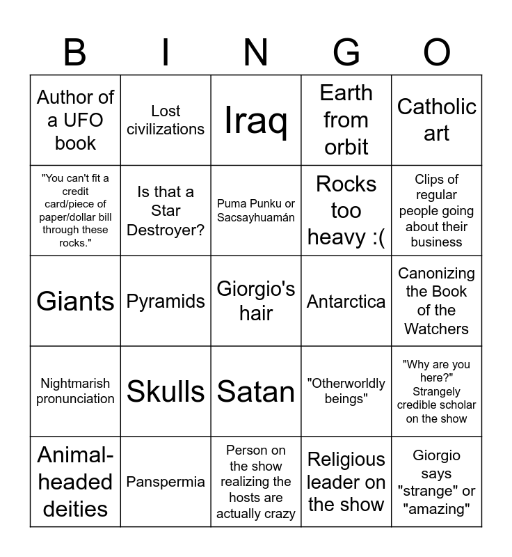 This bingo card has a free space and 52 words: Person on the show who's crazier than the host, Giorgio says "strange" or "amazing", Recurring 'character' (Childress, radio talk show man, etc.) (NOT THE HOST), Person on the show realizing the hosts are actually crazy, Skulls, Something that's just not true, Lost civilizations, Someone pronounces a name incorrectly, "You can't fit a credit card/piece of paper/dollar bill through these rocks.", Advanced and/or misunderstood technology, Is that a Star Destroyer?, Stonehenge, "Why are you here?" Strangely credible scholar on the show, "Otherworldly beings", Thinly veiled ethnocentrism, Annunaki, Puma Punku or Sacsayhuamán, Antarctica, Atmosphere nonsense, Catholic art, Pyramids, Religious leader on the show, Author of a UFO book, Rocks too heavy :(, "Mainstream archaeologists" (etc), Cuneiform, "Even WE couldn't do this!" (lying), Bizarre CGI segment, Clips of regular people going about their business, Stonework is "too good" for its time, "Many researchers" (etc), Earth from orbit, Human evolution madness, Sumeria, Angels, Iraq, Panspermia, Egypt, Iran, Invoking a scientific father, Any word except for "alien", Canonizing the Book of the Watchers, Nightmarish pronunciation, Biblical flood, Satan, Insane theological implications, Rapa nui stone heads, Giants, Taking religious texts 100% seriously, The Hebrew Bible, Animal-headed deities and Giorgio is wearing his funky necklace.