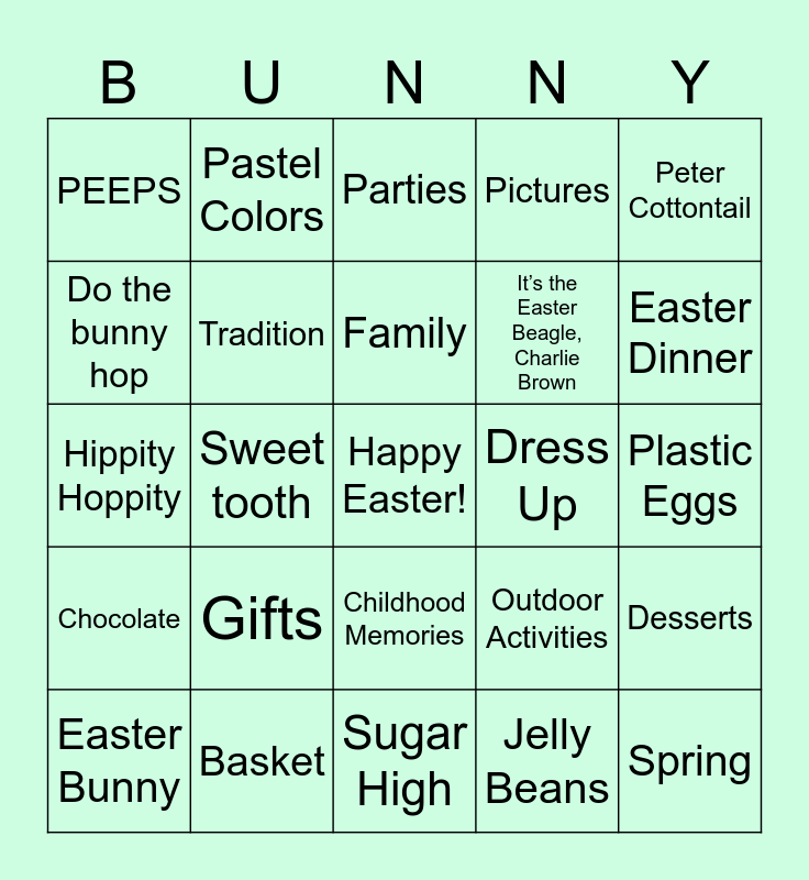 This bingo card has a free space and 34 words: Easter, Jelly Beans, Hollow, Solid, Chocolate, Tradition, Peter Cottontail, Easter Bunny, Pastel Colors, Easter Egg Hunt, Family, Parties, Joy, No School, Dress Up, Easter Dinner, Basket, Hippity Hoppity, Gifts, Outdoor Activities, Childhood Memories, New Memories, PEEPS, Plastic Eggs, Sugar High, Spring, Pictures, Kids having fun, It’s the Easter Beagle, Charlie Brown, Do the bunny hop, Good company, Sweet tooth, Desserts and Games.