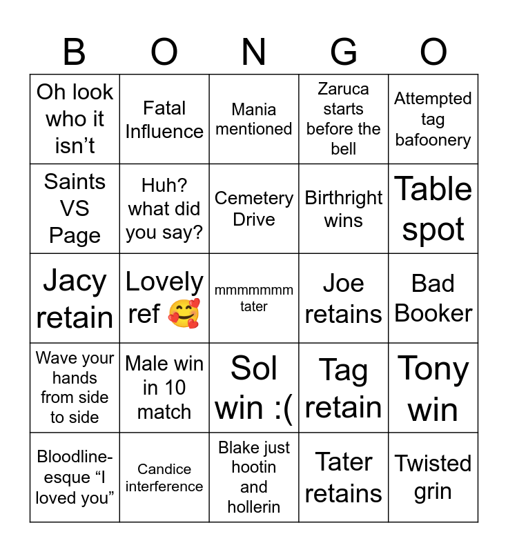 This bingo card has a free space and 24 words: Male win in 10 match, Candice interference, Cemetery Drive, Bloodline-esque “I loved you”, Attempted tag bafoonery, Oh look who it isn’t, Saints VS Page, Fatal Influence, Joe retains, Sol win :(, Birthright wins, Jacy retain, Tag retain, Tony win, Huh? what did you say?, Tater retains, Bad Booker, Mania mentioned, Table spot, Lovely ref 🥰, Twisted grin, Wave your hands from side to side, Zaruca starts before the bell and Blake just hootin and hollerin.