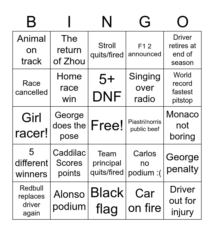 This bingo card has a free space and 24 words: Caddilac Scores points, Alonso podium, 5+ DNF, Redbull replaces driver again, Driver retires at end of season, Animal on track, Race cancelled, The return of Zhou, Piastri/norris public beef, Team principal quits/fired, Singing over radio, Girl racer!, Carlos no podium :(, George penalty, Home race win, Car on fire, Monaco not boring, Stroll quits/fired, World record fastest pitstop, George does the pose, Driver out for injury, 5 different winners, F1 2 announced and Black flag.