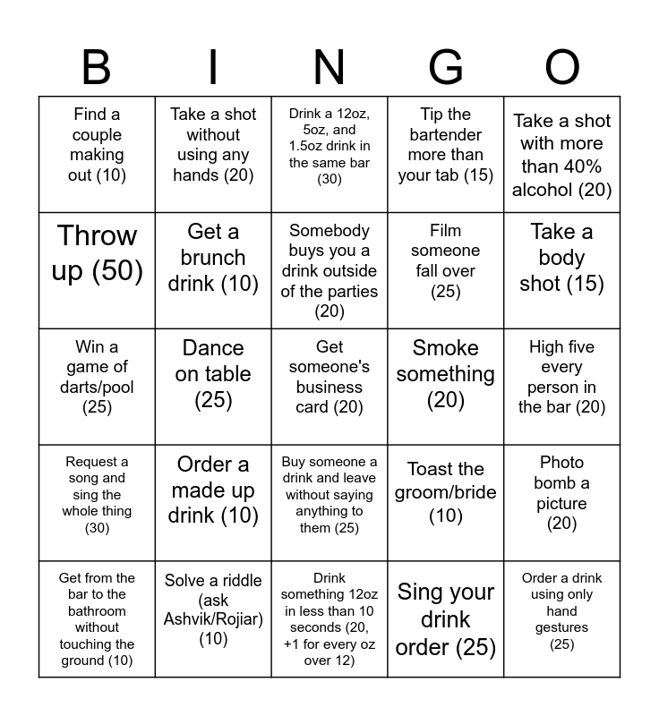 This bingo card has 25 words: Order a made up drink (10), Drink something 12oz in less than 10 seconds (20, +1 for every oz over 12), Somebody buys you a drink outside of the parties (20), Get from the bar to the bathroom without touching the ground (10), Take a shot with more than 40% alcohol (20), Find a couple making out (10), Throw up (50), Take a shot without using any hands (20), Smoke something (20), Buy someone a drink and leave without saying anything to them (25), Film someone fall over (25), Win a game of darts/pool (25), Toast the groom/bride (10), Photo bomb a picture (20), Get a brunch drink (10), Order a drink using only hand gestures (25), High five every person in the bar (20), Drink a 12oz, 5oz, and 1.5oz drink in the same bar (30), Take a body shot (15), Dance on table (25), Get someone's business card (20), Solve a riddle (ask Ashvik/Rojiar) (10), Request a song and sing the whole thing (30), Tip the bartender more than your tab (15) and Sing your drink order (25).